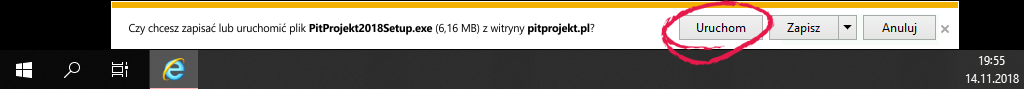 Na pasku u dołu przeglądarki Internet Explorer należy kliknąć na Uruchom aby rozpocząć pobieranie. Jeśli plik nie pobiera się automatycznie, kliknij tutaj.