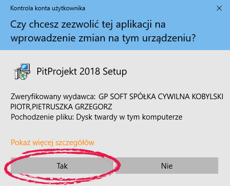 Na oknie "Kontrola konta użytkownika" należy zezwolić na uruchomienie instalatora programu. W tym celu należy kliknąć na przycisk Tak