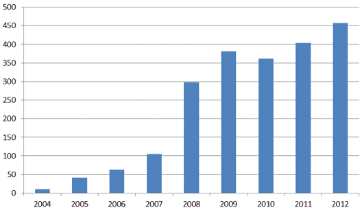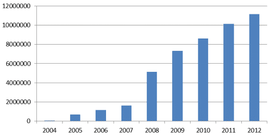 Wraz z diametralnym wzrostem (od 2008 roku) liczby "świadomych" podatników przekazujących 1% swojego podatku, wzrastają kwoty przekazywane na rzecz OPP. Obserwujemy to na kolejnym modelu: