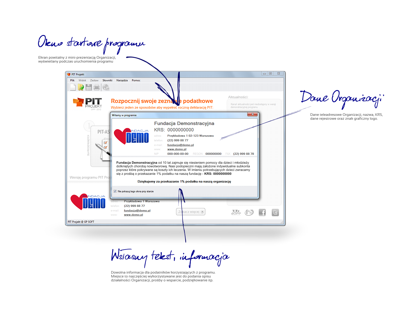Jednym z ważniejszych obiektów programu PIT Projekt które można elastycznie dostosowywać jest tzw. "Okno startowe" (ekran powitalny). Pojawia się ono wraz z uruchomieniem programu i zawiera przeważnie podastawowe informacje o Państwa Organizacji takie jak: nazwa, krs, adres, telefony, fax, e-mail, adres www, logo oraz tekst powitalny typu: